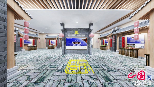 第四號展廳“第三屆昆滇老字號老品牌商標(biāo)展廳”以老昆明街巷為設(shè)計元素,整個展廳就是一條極具老昆明特色的街道,青色屋檐與紅色燈籠相映照,叫賣聲此起彼伏,充滿熱鬧的市井氣息。