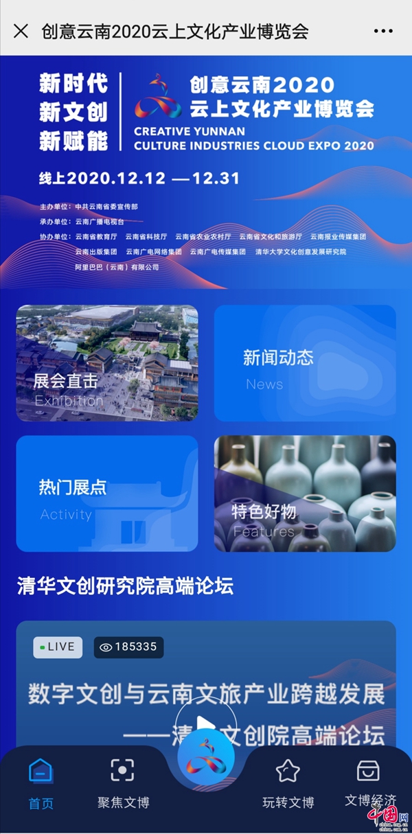 12月12日,創(chuàng)意云南2020云上文化產業(yè)博覽會(簡稱“文博會”)正式拉開序幕。線上云展會與昆明、玉溪、保山、麗江等線下分會場同時開展。