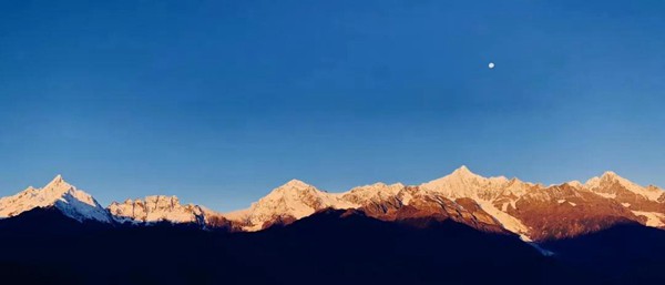 在晴日的凌晨,太陽光越過阻礙照射在雪山頂上,然后逐漸擴(kuò)大,形成絕美的“日照金山”奇觀,持續(xù)20分鐘左右,最后雪山整體變白,失去金色影象;有時太陽已經(jīng)升起,月亮尚未落山,便形成難得一見的“日月同輝”奇觀。
