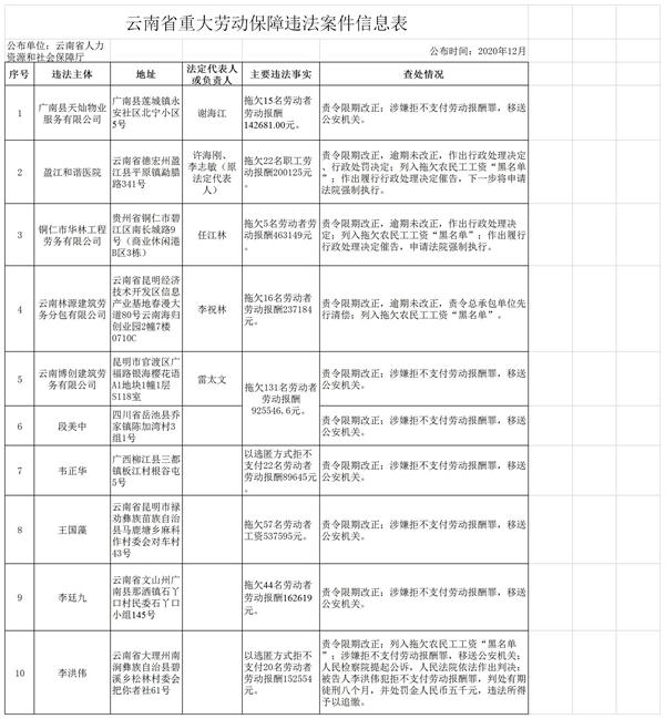 近日,云南省人力資源和社會保障廳向社會公布了一批重大勞動保障違法案件。本次公布的案件共10件,涉及5個用人單位和5個自然人,均是今年以來云南省部分州(市)、縣(市、區(qū))人力資源社會保障部門查處的工資支付類重大勞動保障違法案件,其中:7件因涉嫌拒不支付勞動報(bào)酬罪被移送公安機(jī)關(guān)偵辦,4件被列入拖欠農(nóng)民工工資“黑名單”,1件由總承包單位先行清償欠薪,1件法院已依法作出判決。