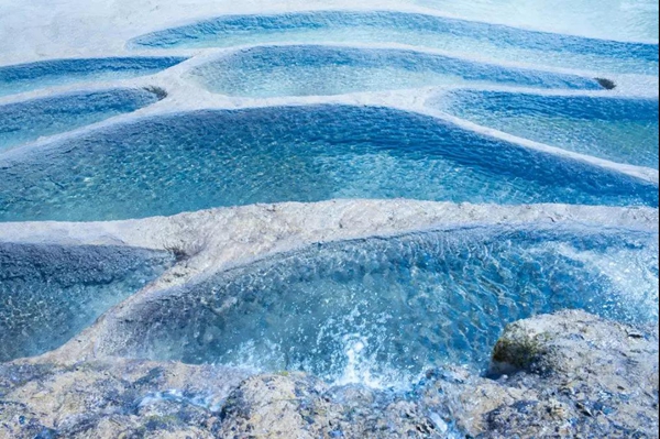 天然雕塑群落的底座,一層層疊加,參差不齊,錯(cuò)落有致,每一個(gè)月牙形彩池都有池底、池埂都注滿了水。