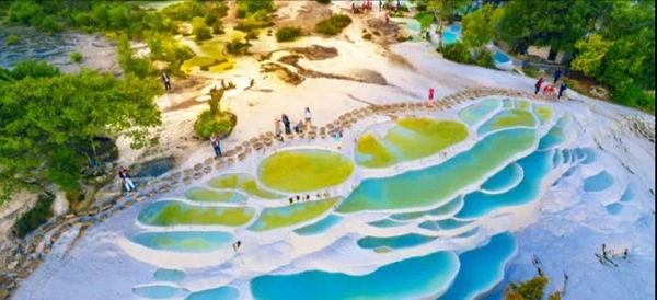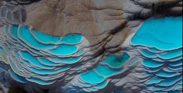 藍(lán)綠的泉水,其實(shí)是透明的,由于水中礦物含量很高,水體的折射率大,通過光線吸收反射,呈現(xiàn)出了海洋一般的碧藍(lán)色。