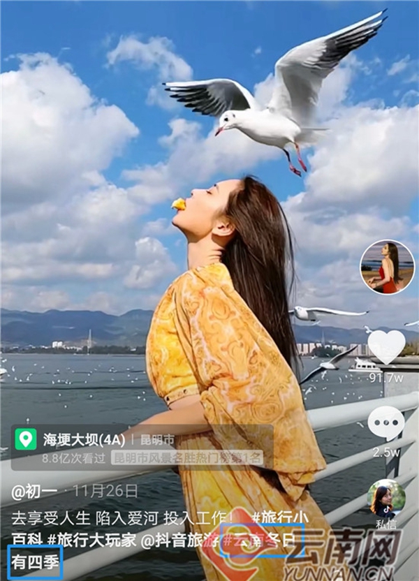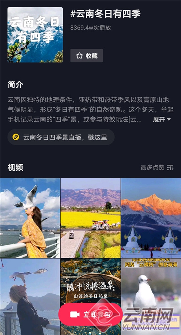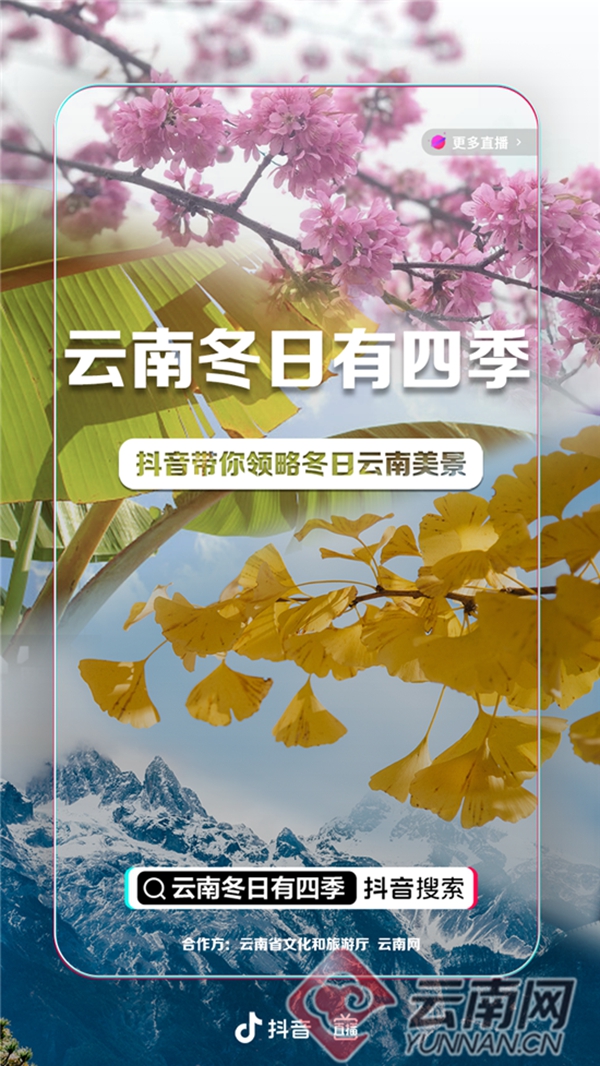 12月31日,由云南省文化和旅游廳攜手抖音平臺發(fā)起的“云南冬日有四季”互動“話題+直播”活動圓滿收官。17天里,來自省內(nèi)外網(wǎng)友積極參與#云南冬日有四季話題投稿,“解鎖”云南冬季中隱藏的“春、夏、秋、冬”,視頻累計播放量高達8369.4萬次。