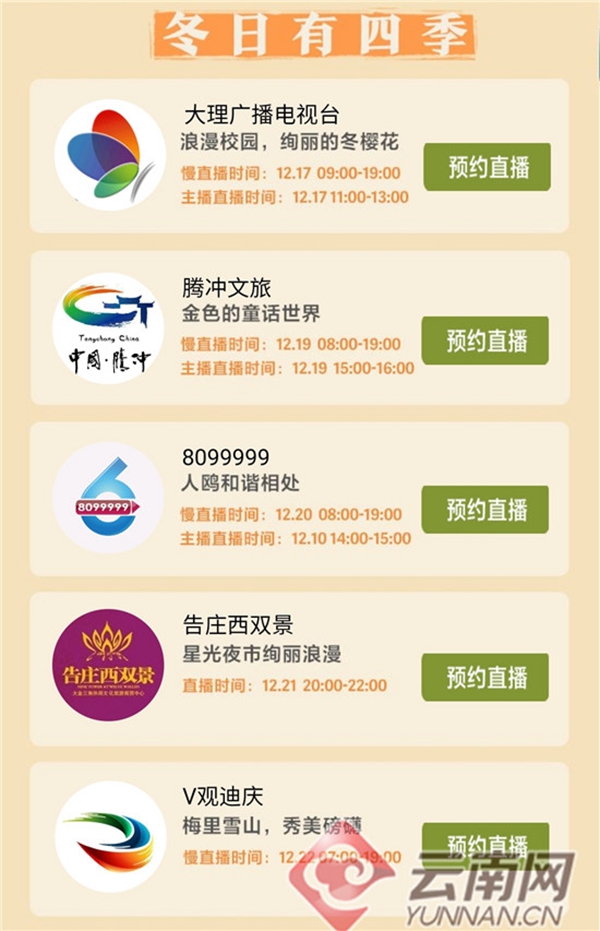 其中,12月16日,大理大學的冬櫻花直播帶2.4萬網(wǎng)友感受了一把“春日”的浪漫;12月18日,騰沖銀杏村直播吸引了近萬名網(wǎng)友共同走進金色的童話世界;12月19日,海埂大壩直播帶6.6萬網(wǎng)民連線“云南人的老朋友”紅嘴鷗;12月20日,告莊西雙景直播則帶著網(wǎng)友“穿越”回夏日穿短袖逛夜市的時光;12月22日,梅里雪山直播讓近萬名網(wǎng)友一睹了“日照金山”勝景。