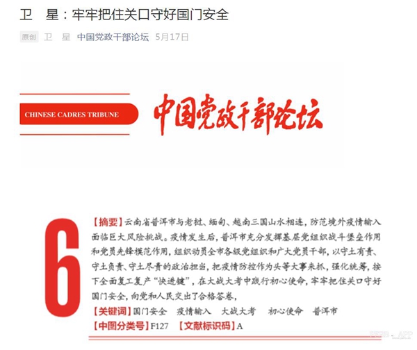 5月17日,中共中央黨校主辦的《中國黨政干部論壇》刊發(fā)了普洱市委書記衛(wèi)星的署名文章《牢牢把住關口守好國門安全》。文章全面闡述了普洱市認真貫徹落實習近平總書記重要指示批示精神,把統(tǒng)籌推進新冠肺炎疫情防控和經(jīng)濟社會發(fā)展作為檢驗“四個意識”牢固不牢固,“四個自信”堅定不堅定,“兩個維護”堅決不堅決的試金石,用守土有責、守土負責、守土盡責的政治擔當,牢牢把住關口守好國門安全的生動實踐。