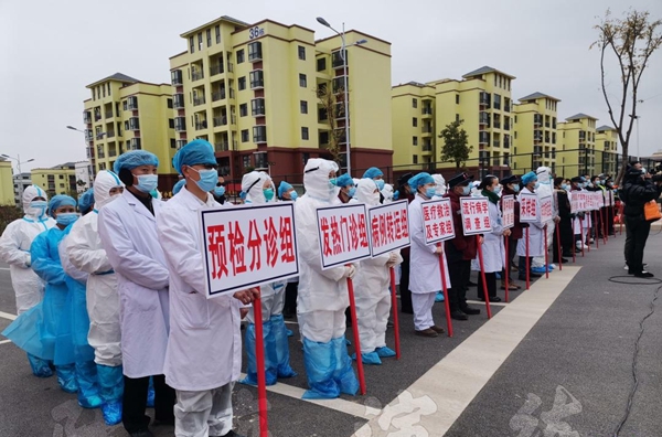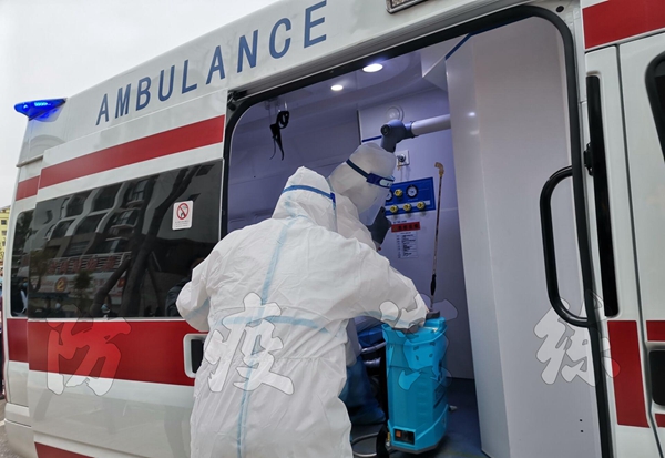 本次新冠肺炎疫情防控應(yīng)急演練模擬場景為:家住圓夢社區(qū)的周某因身體不適到社區(qū)衛(wèi)生室就診,在預(yù)檢分診處掃健康碼顯示為黃碼,體溫38℃,醫(yī)護人員當(dāng)即重視起來,詢問其病史及旅居史,得知周某曾在某中風(fēng)險地區(qū)務(wù)工,于1天前乘高鐵回家,并已出現(xiàn)發(fā)熱、干咳、乏力等癥狀,在做了信息登記后,及時引導(dǎo)周某到發(fā)熱門診進行復(fù)診,復(fù)核體溫依舊為38.0℃,經(jīng)過相關(guān)檢測,胸部CT回報提示肺部有磨玻璃樣改變,核酸檢測提示“陽性”。發(fā)熱門診立即向縣醫(yī)院、縣疾控中心、縣衛(wèi)生健康局逐級上報信息。收到報告后,縣醫(yī)院立即啟動《廣南縣人民醫(yī)院(定點治療醫(yī)院)新型冠狀病毒防控應(yīng)急處置預(yù)案》,將周某轉(zhuǎn)運到感染科隔離病區(qū)進行救治,同時流調(diào)人員對周某進行流行病學(xué)調(diào)查,并對該病人進行再次核實采樣送省疾控中心檢測。省疾病預(yù)防控制中心復(fù)核結(jié)果為陽性,綜合流行病學(xué)史、臨床表現(xiàn)、實驗室檢測和影像學(xué)檢查結(jié)果,診斷為新冠肺炎確診病例普通型。隨后,轉(zhuǎn)運組醫(yī)護人員與感染科做好患者的病情交接,并啟用負壓救護車將患者轉(zhuǎn)運至文山州醫(yī)院進行后續(xù)治療。指揮部收到衛(wèi)生健康局報告后立即啟動《廣南縣新冠肺炎疫情防控應(yīng)急預(yù)案》。