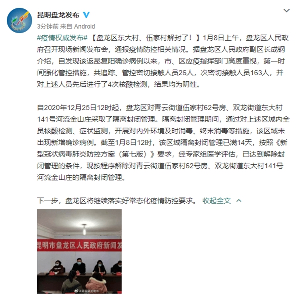 截至1月8日12時,該區(qū)域隔離封閉管理已滿14天,未出現(xiàn)新增確診病例。按照《新型冠狀病毒肺炎防控方案(第七版)》要求,經(jīng)專家組醫(yī)學(xué)評估,已達到解除封閉管理的條件,現(xiàn)按程序解除對青云街道伍家村62號房、雙龍街道東大村141號河流金山莊的隔離封閉管理。
