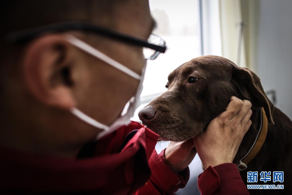 4月22日,中國導盲犬大連培訓基地的訓導員張新璐為在訓犬“夏天”進行日常的身體情況檢查。新華社記者 潘昱龍 攝