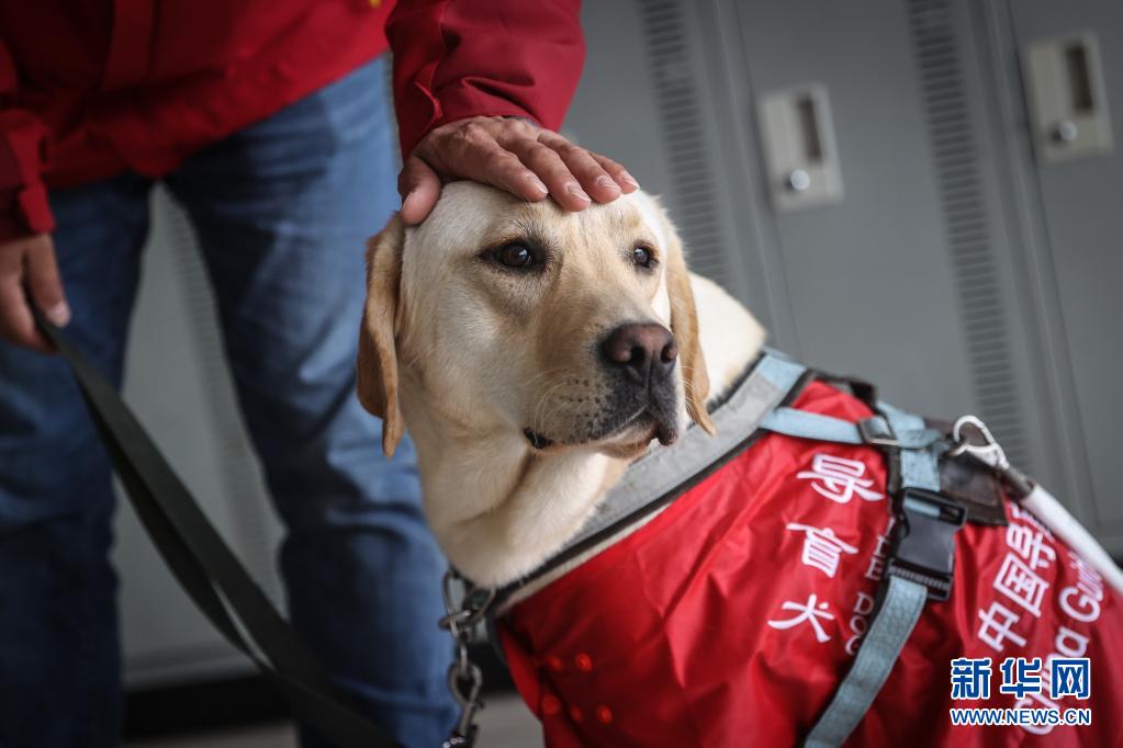4月22日,中國(guó)導(dǎo)盲犬大連培訓(xùn)基地的訓(xùn)導(dǎo)員付明巖與在訓(xùn)犬“沐沐”在訓(xùn)練中。新華社記者 潘昱龍 攝