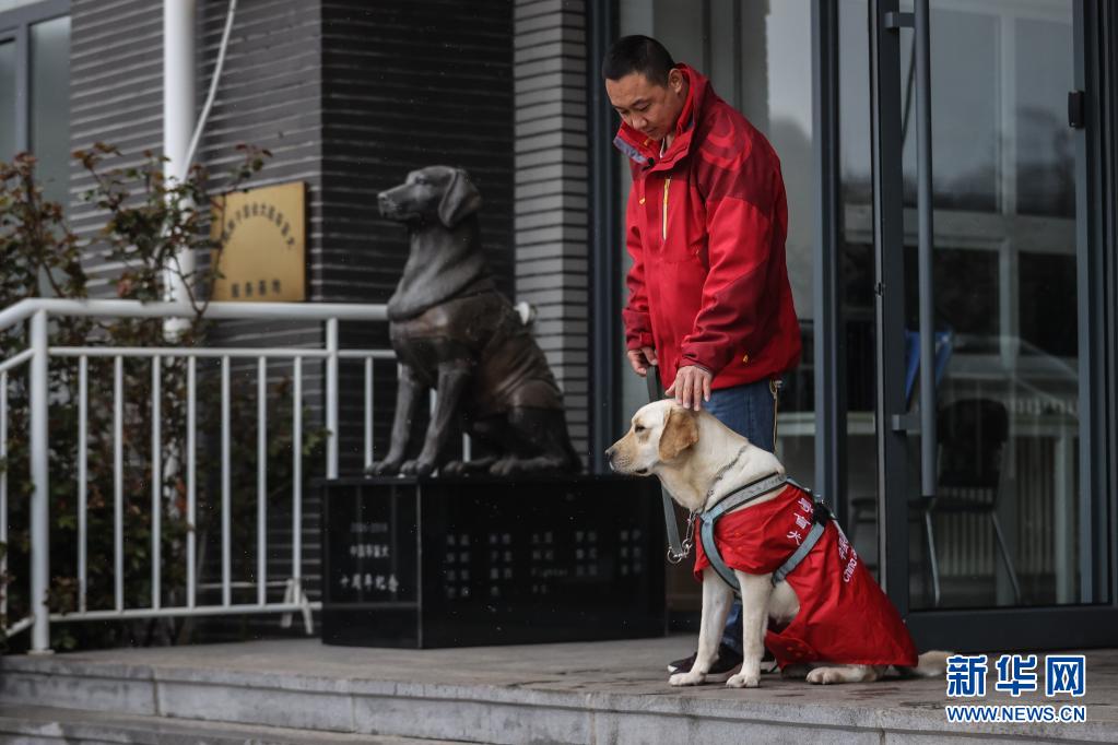 4月22日,中國(guó)導(dǎo)盲犬大連培訓(xùn)基地的訓(xùn)導(dǎo)員付明巖對(duì)在訓(xùn)犬“沐沐”進(jìn)行訓(xùn)練。新華社記者 潘昱龍 攝