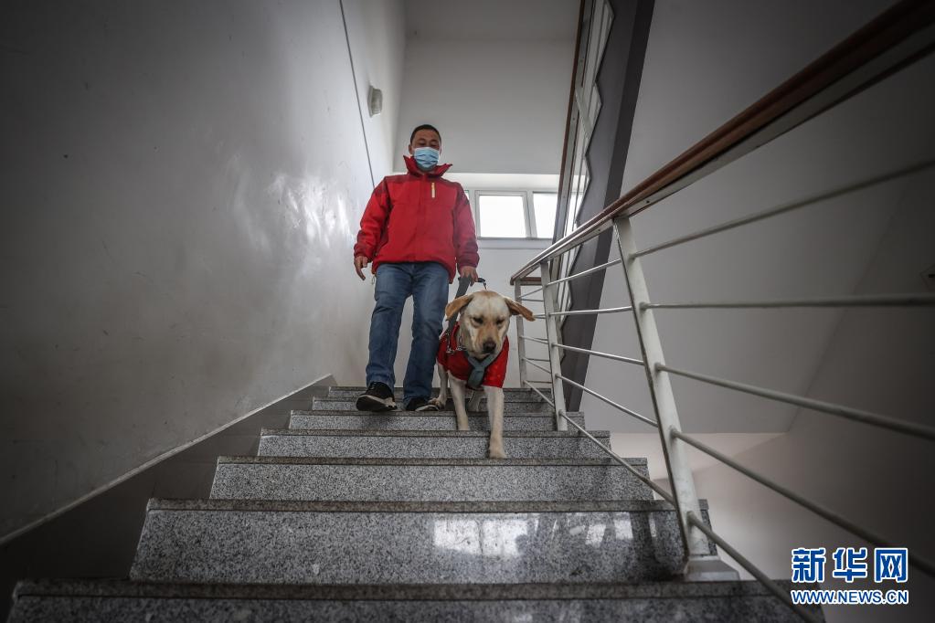 4月22日,中國導盲犬大連培訓基地的訓導員付明巖對在訓犬“沐沐”進行走樓梯訓練。新華社記者 潘昱龍 攝