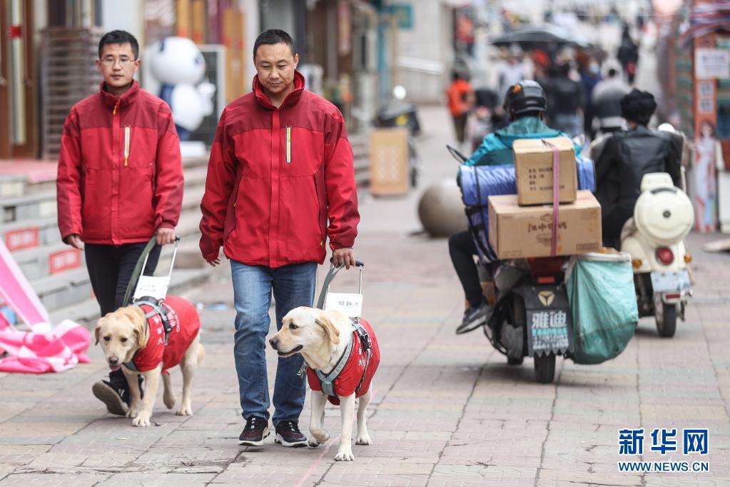 4月23日,中國(guó)導(dǎo)盲犬大連培訓(xùn)基地的訓(xùn)導(dǎo)員付明巖(右)和姜博雅(左)對(duì)在訓(xùn)犬“沐沐”(右下)和“酷K”(左下)進(jìn)行訓(xùn)練。新華社記者 潘昱龍 攝