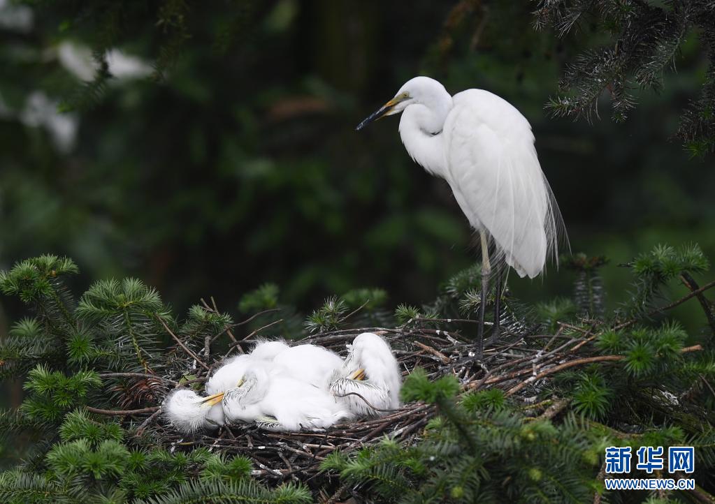 在南昌市新建區(qū)象山森林公園內(nèi),白鷺和雛鳥(niǎo)們?cè)谝黄穑?月18日攝)。