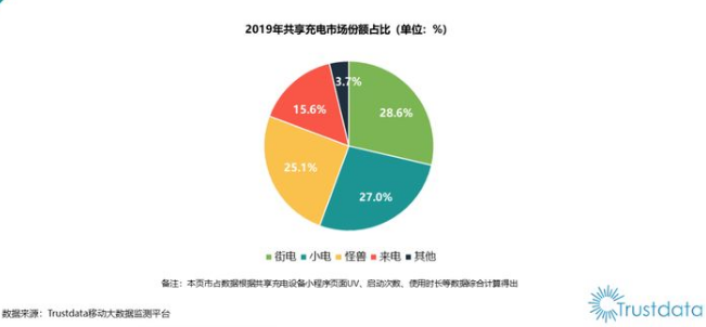 2019年時,街電、小電、怪獸充電、來電“三電一獸”的市場格局基本形成。根據(jù)TrustData移動大數(shù)據(jù)監(jiān)測平臺的統(tǒng)計,2019年,上述4家企業(yè)的市場份額占比分別為28.6%、27%、25.1%和15.6%,來電科技位居第四。