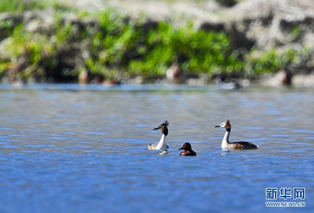 6月14日在拉魯濕地拍攝的兩只鳳頭 和一只小 (中)。夏日里,鳳頭 和小 在西藏拉薩拉魯濕地國(guó)家級(jí)自然保護(hù)區(qū)水面上嬉戲。新華社記者 張汝鋒 攝