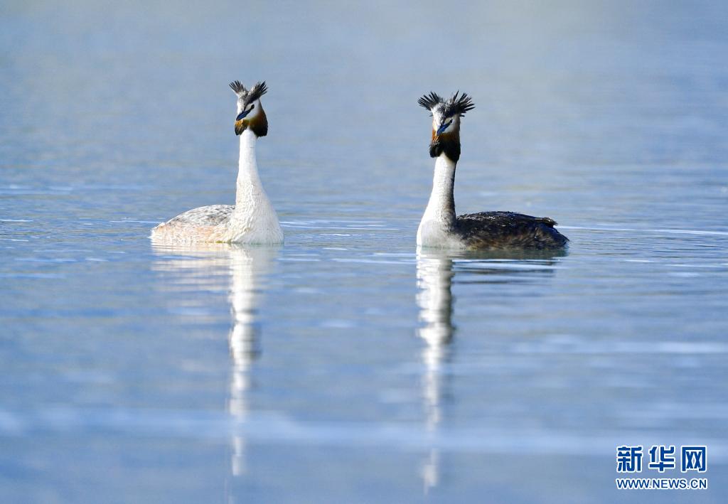 6月14日在拉魯濕地拍攝的兩只鳳頭 。夏日里,鳳頭 和小 在西藏拉薩拉魯濕地國家級自然保護區(qū)水面上嬉戲。新華社記者 張汝鋒 攝