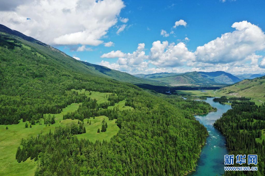 6月10日拍攝的新疆阿勒泰地區(qū)喀納斯景區(qū)景色(無人機照片)。