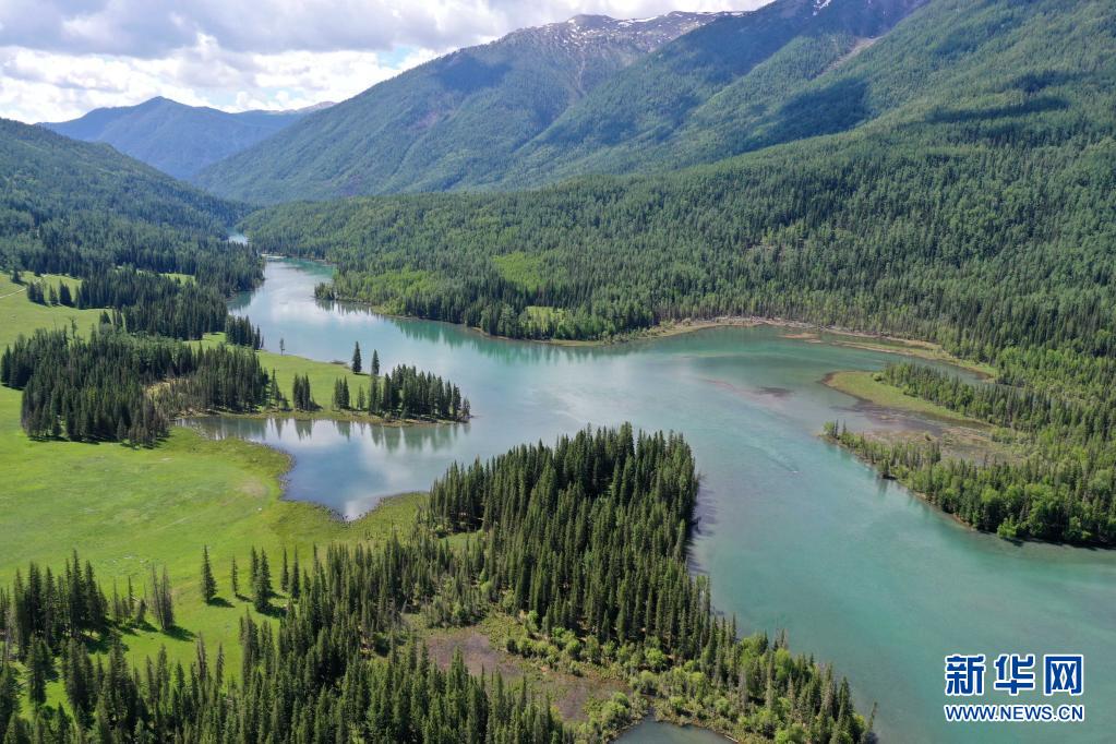 6月10日拍攝的新疆阿勒泰地區(qū)喀納斯景區(qū)神仙灣景色(無人機照片)。