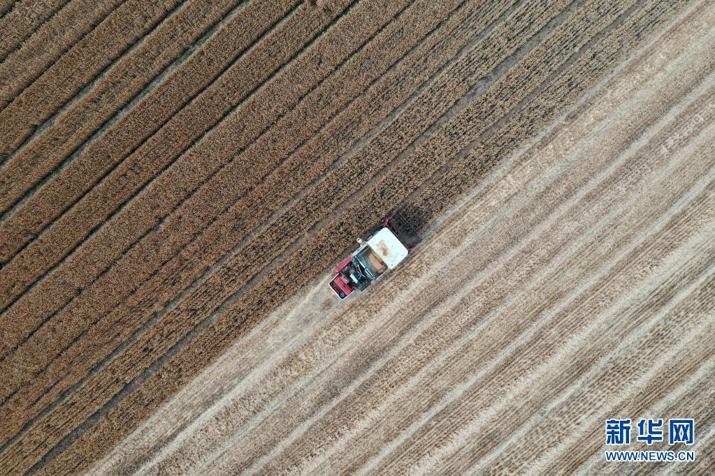 6月10日,收割機在山東鄒城太平鎮(zhèn)一處麥田收割小麥(無人機照片)。