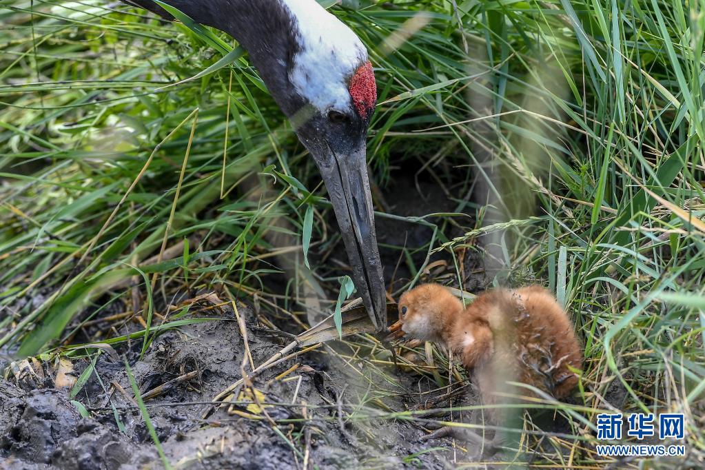 6月20日至21日,一對由吉林莫莫格國家級自然保護(hù)區(qū)管理局人工繁育的丹頂鶴,在野化放歸后成功繁殖出兩只雛鶴。