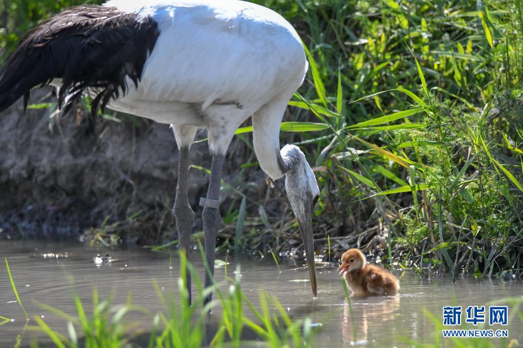 6月21日,成年丹頂鶴帶領(lǐng)雛鶴在水中覓食。新華社記者 張楠 攝