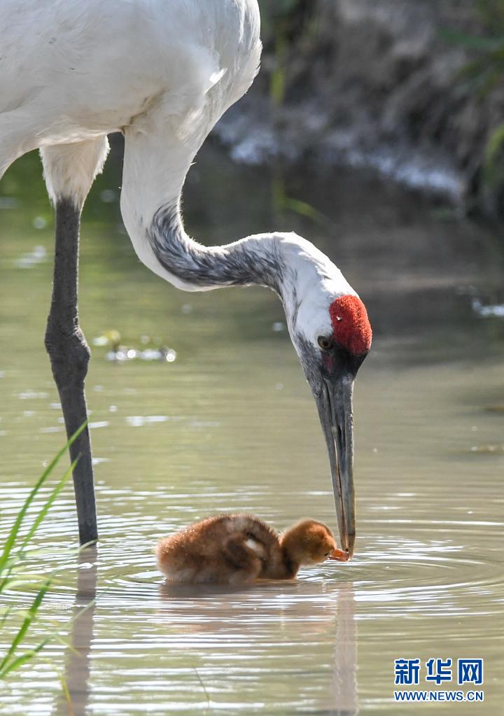 6月21日,成年丹頂鶴給雛鶴喂食。新華社記者 張楠 攝