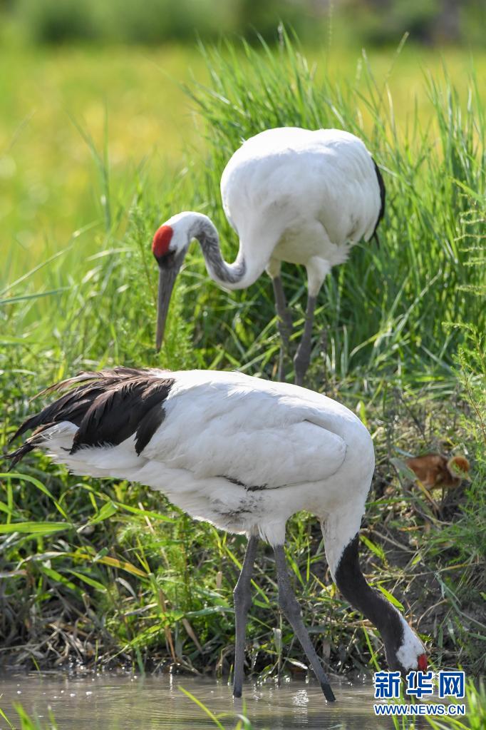 6月21日,丹頂鶴一家棲息在水邊。新華社記者 張楠 攝