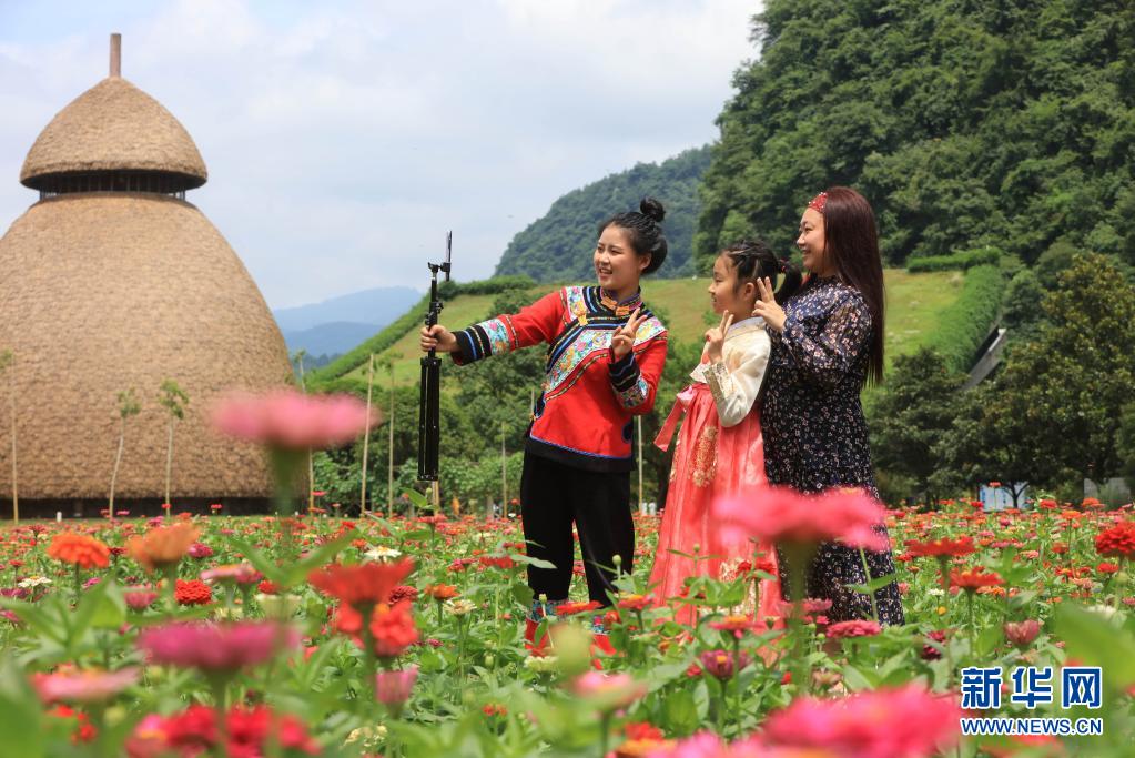 夏日的湖南張家界市武陵源區(qū)黃龍洞景區(qū),成片的百日菊形成色彩斑斕的花海,花香四溢,吸引游客前來賞花游玩。