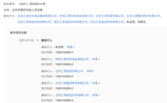 近日,據(jù)天眼查,包括北京匯源飲料食品集團(tuán)有限公司(下稱“北京匯源集團(tuán)”)等在內(nèi)的7家匯源果汁旗下公司,以及朱新禮、朱圣琴新增一條被執(zhí)行人信息,執(zhí)行標(biāo)的超15.90億元。天眼查還顯示,北京匯源集團(tuán)歷史上已收到100次限制消費(fèi)令,其中2020年1月14日至7月27日,匯源飲料食品公司收到4次欠稅公告,欠稅總金額超137萬元。