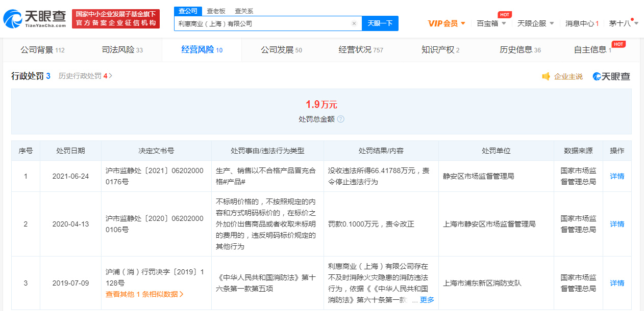 值得注意的是,利惠商業(yè)(上海)有限公司還曾因違反明碼標(biāo)價(jià)規(guī)定被處罰。