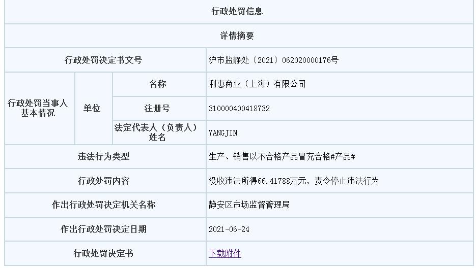 中新經(jīng)緯客戶端從上海市市場(chǎng)監(jiān)管局網(wǎng)站查詢到,此案行政處罰決定書文號(hào)為滬市監(jiān)靜處〔2021〕062020000176號(hào),處罰當(dāng)事人為利惠商業(yè)(上海)有限公司,處罰事由為生產(chǎn)、銷售以不合格產(chǎn)品冒充合格產(chǎn)品,處罰結(jié)果為靜安區(qū)市場(chǎng)監(jiān)督管理局對(duì)其沒(méi)收違法所得66.41788萬(wàn)元,責(zé)令停止違法行為。