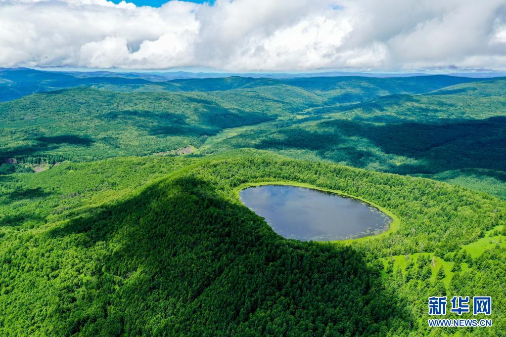 這是7月14日拍攝的阿爾山國家森林公園內(nèi)的天池(無人機(jī)照片)。