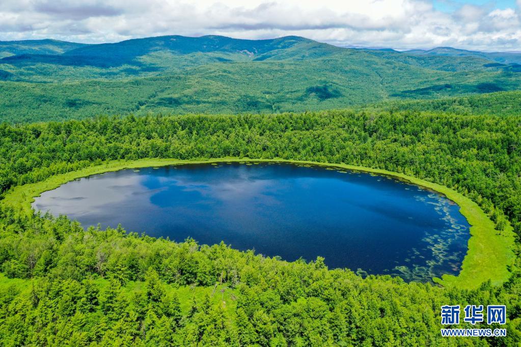 這是7月14日拍攝的阿爾山國家森林公園內(nèi)的天池(無人機(jī)照片)。