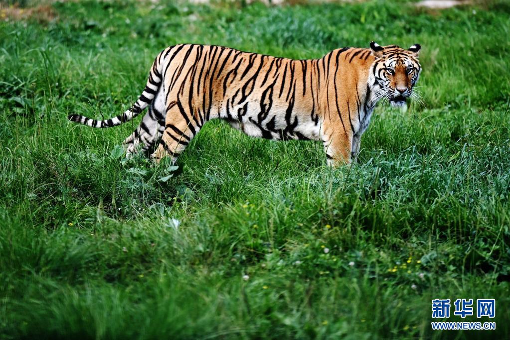 在橫道河子?xùn)|北虎林園野化訓(xùn)練區(qū),一只東北虎在走動(dòng)(7月26日攝)。