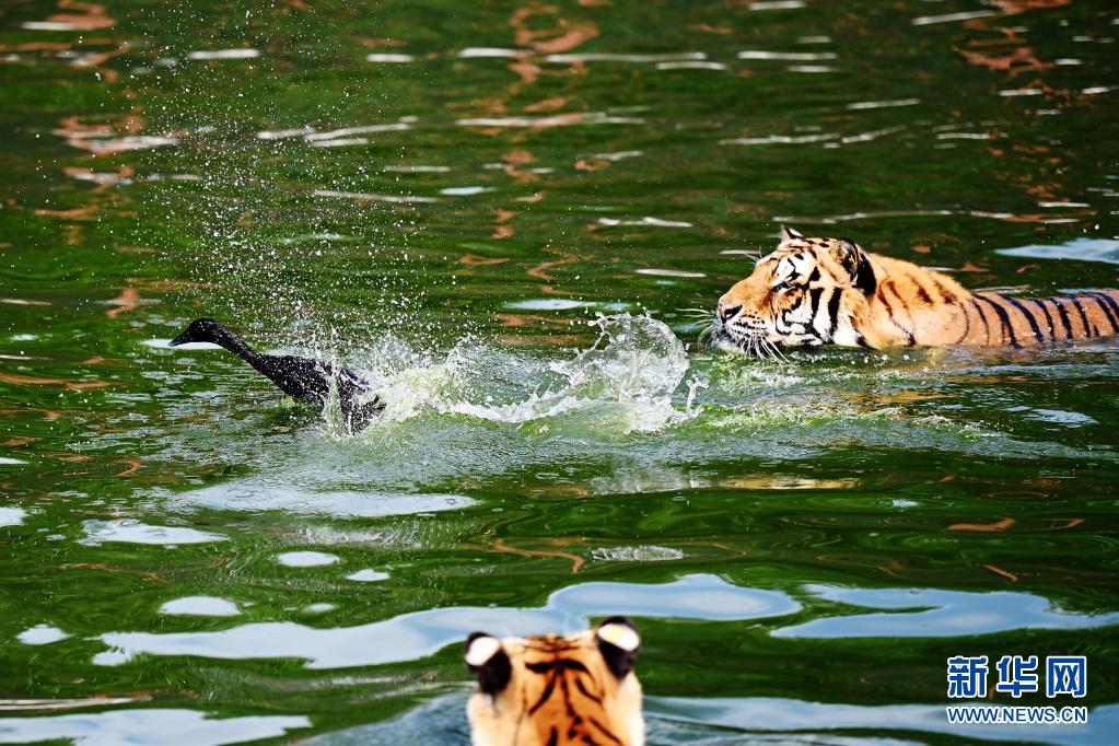 在橫道河子東北虎林園野化訓練區(qū)水池中,東北虎在捕食鴨子(7月26日攝)。