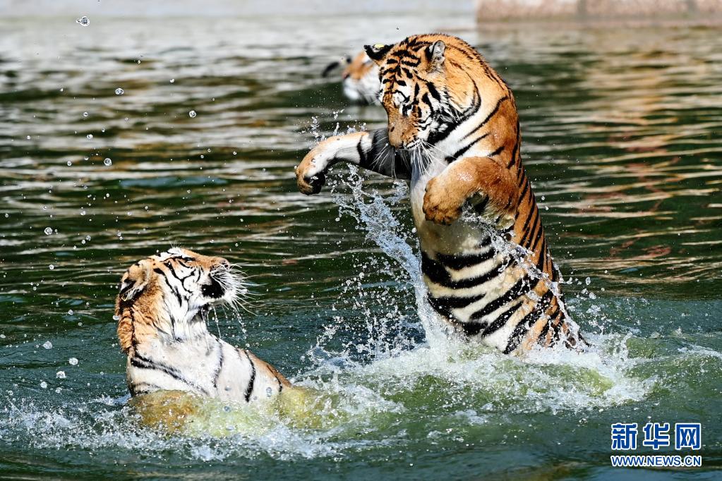 在橫道河子?xùn)|北虎林園野化訓(xùn)練區(qū)水池中,兩只東北虎在打鬧(7月26日攝)。