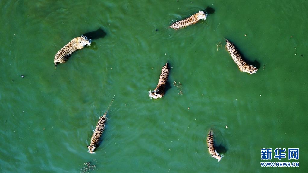 這是7月27日拍攝的橫道河子?xùn)|北虎林園野化訓(xùn)練區(qū)水池中的東北虎(無(wú)人機(jī)照片)。