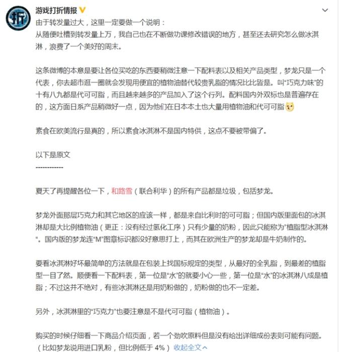但微博認(rèn)證為知名博主的“游戲打折情報”稱,歐洲生產(chǎn)的夢龍是牛奶制作的,國內(nèi)卻不是;配料表第一位是“水”的就要小心一些,其冰淇淋八成是植脂。