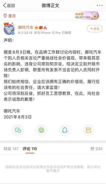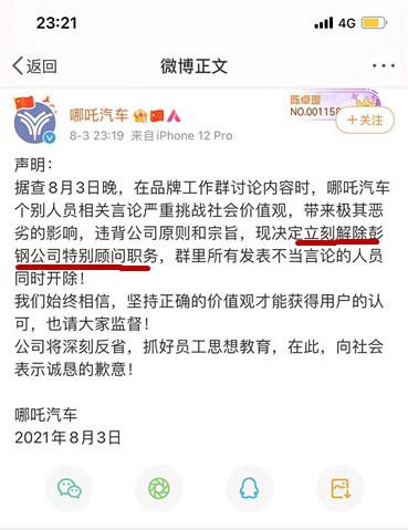 哪吒汽車在這份聲明中表示,“據(jù)查8月3日晚,在品牌工作群討論內(nèi)容時,哪吒汽車個別人員相關(guān)言論嚴重挑戰(zhàn)社會價值觀,帶來極其惡劣的影響,違背公司原則和宗旨,現(xiàn)決定立刻開除市場負責(zé)人彭鋼,群里所有發(fā)表不當(dāng)言論的人員同時開除!”