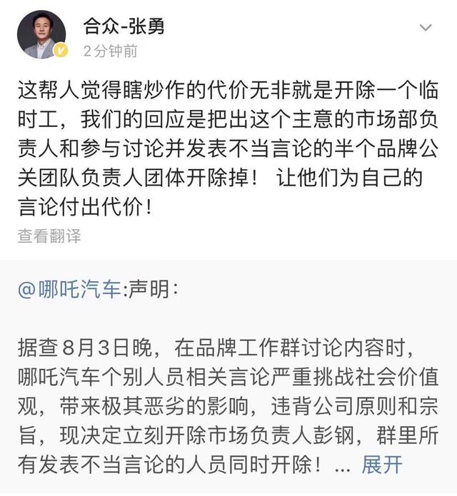 事件發(fā)生之后,哪吒汽車CEO張勇在社交平臺上表示,“把出這個主意的市場公關(guān)部負責(zé)人和參與討論并發(fā)表不當(dāng)言論的半個品牌公關(guān)團隊負責(zé)人團隊開除掉!”