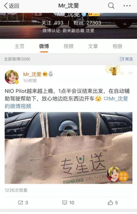 蔚來(lái)副總裁沈斐曾經(jīng)發(fā)微博稱(chēng),“NIO Pliot越來(lái)越上癮了,一點(diǎn)半會(huì)議結(jié)束出發(fā),在自動(dòng)輔助駕駛幫助下,放心邊吃東西邊開(kāi)車(chē)了?!蹦壳?,此條微博已被刪除。