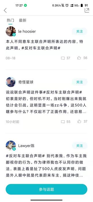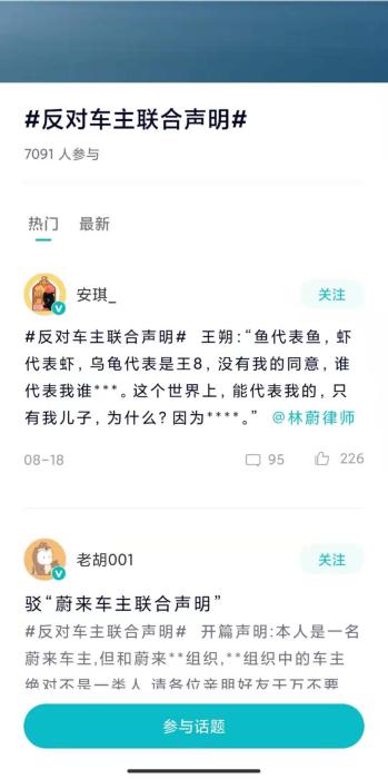 8月18日晚間,有車(chē)主在蔚來(lái)APP創(chuàng)建了#反對(duì)車(chē)主聯(lián)合聲明#的話(huà)題。截至19日發(fā)稿時(shí),已有超7000人參與話(huà)題。