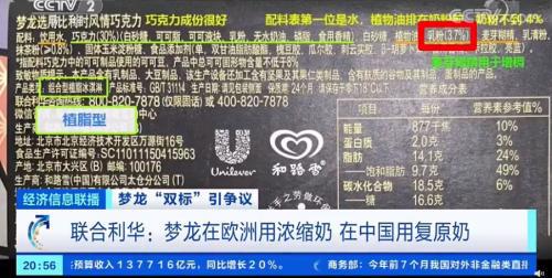 日前,有網(wǎng)友在社交媒體發(fā)布消息稱,聯(lián)合利華公司旗下的夢(mèng)龍冰淇淋中外用料不同。其國(guó)內(nèi)版巧克力層里面的冰淇淋是由大比例的植物油制成的,只含有少量奶粉,而在歐洲市場(chǎng)銷售的冰淇淋產(chǎn)品卻是使用牛奶為原料制作的。