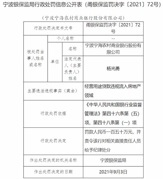 據(jù)中國(guó)銀保監(jiān)會(huì)網(wǎng)站顯示,9月10日披露寧波銀保監(jiān)局行政處罰信息公開(kāi)表(甬銀保監(jiān)罰決字〔2021〕72號(hào)),寧波寧海農(nóng)村商業(yè)銀行股份有限公司存在經(jīng)營(yíng)用途貸款違規(guī)流入房地產(chǎn)領(lǐng)域的主要違法違規(guī)事實(shí)。