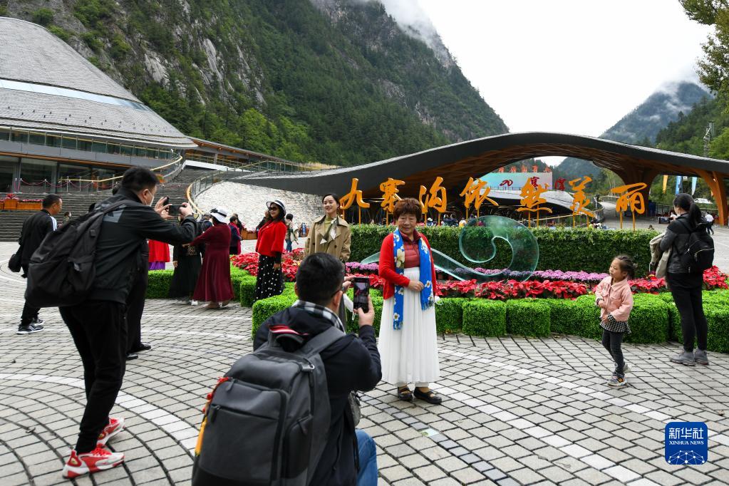 在四川省九寨溝景區(qū),游客在景區(qū)門(mén)口拍照留念(9月27日攝)。