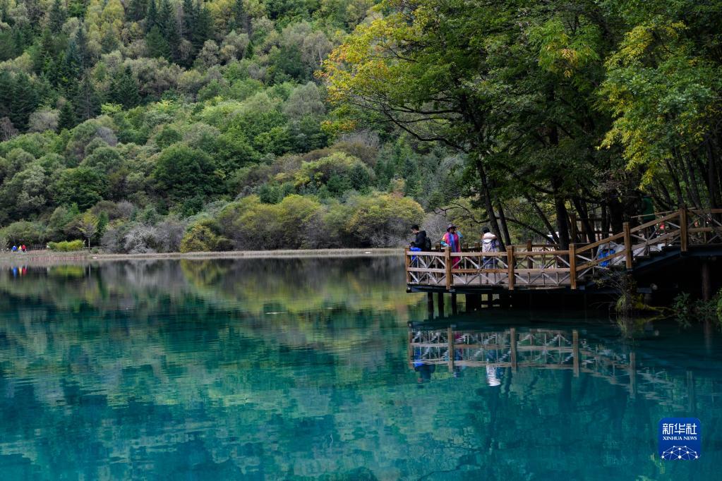 在四川省九寨溝景區(qū),游客在五花海觀景平臺(tái)上拍照留念(9月27日攝)。
