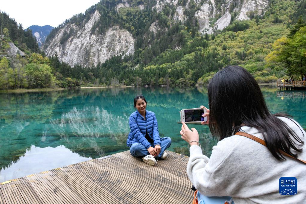 在四川省九寨溝景區(qū),游客在五花海邊拍照留念(9月27日攝)。