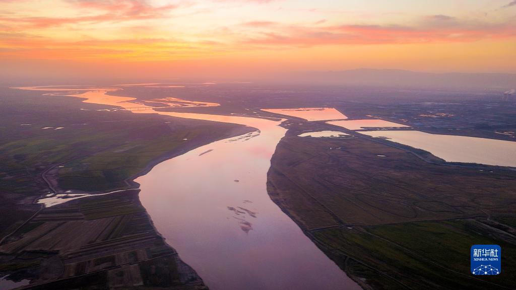 這是在內蒙古鄂爾多斯市達拉特旗境內拍攝的黃河夕照景觀(9月26日攝,無人機照片)。