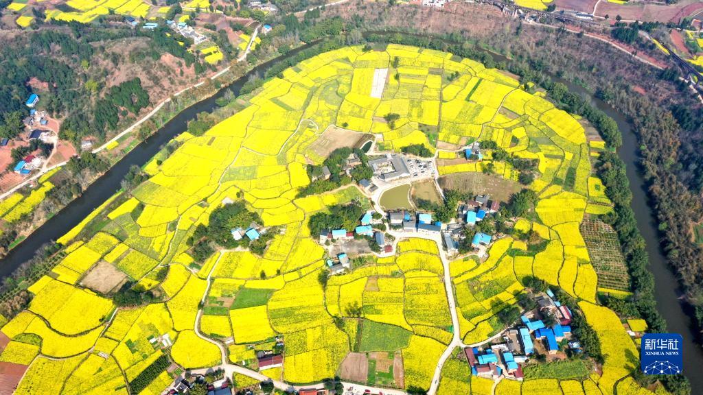 3月8日拍攝的四川省眉山市仁壽縣青崗鄉(xiāng)盤龍村油菜花田(無人機(jī)照片)。
