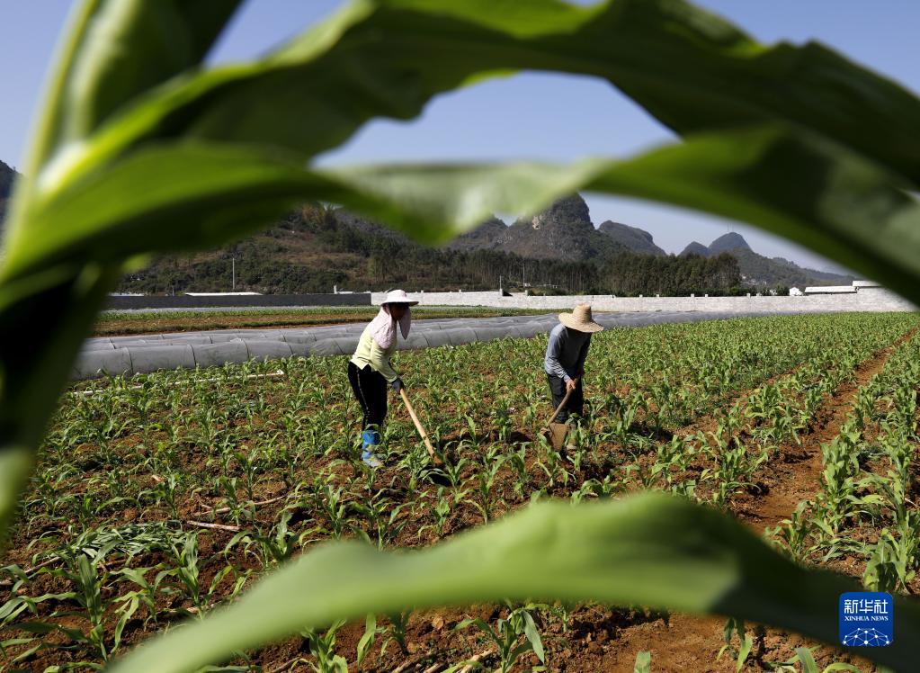 3月8日,廣西來賓市忻城縣城關鎮(zhèn)板河村農民在田間管護糯玉米苗。
